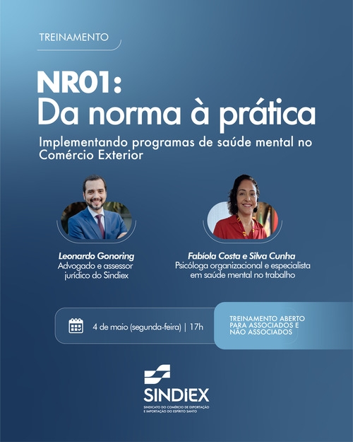 Acontece Sindiex: Treinamento sobre a NR01 está com inscrições abertasPublicado em 24/04/2026 Com a proximidade da entrada em vigor das novas exigências da NR01, que passam a ampliar a atenção aos riscos psicossociais no ambiente de trabalho e podem gerar penalidades e multas em caso de descumprimento, o Sindiex promove, no dia 4 de maio, às 17h, o treinamento "NR 01: Da norma à prática | Implementando programas de saúde mental no Comércio Exterior”. O encontro tem como proposta orientar empresas do setor sobre a aplicação prática da norma, abordando como estruturar programas de saúde mental e adequar processos internos às novas regras. A condução será feita por Leonardo Gonoring, advogado e assessor jurídico do Sindiex, e Fabíola Costa e Silva Cunha, psicóloga organizacional e especialista em saúde mental no trabalho. O treinamento é aberto para associados e não associados, em um movimento do Sindiex de apoiar o setor com informação qualificada e preparação para as mudanças regulatórias que impactam diretamente a gestão empresarial. Inscrições: clique aqui. Reuniões do Recomex Dois encontros importantes foram realizados nas últimas semanas no âmbito do Recomex-ES. As agendas deram continuidade às discussões sobre compensação de incentivos fiscais, impactos nas operações de importação e estratégias para preservação da competitividade do Estado. No fim do último mês, foi realizada a reunião do grupo de trabalho sobre Fundos de Compensação e IBS-Importação, com foco em análises técnicas e jurídicas da proposta. Já no dia 7 de abril, o conselho voltou a se reunir para avançar nas estratégias voltadas à manutenção da atividade econômica do Espírito Santo no cenário pós-reforma tributária, fortalecendo a construção conjunta de soluções para o ambiente de negócios capixaba. Projeto Vinhos do Mercosul O Sindiex participou, no dia 10 de março de 2026, de forma on-line, de encontro do Projeto Vinhos do Mercosul, iniciativa voltada à promoção comercial e ao fortalecimento da presença dos vinhos produzidos no bloco nos mercados nacional e internacional. A ação teve como objetivo ampliar oportunidades de negócios, aproximando produtores, importadores e demais agentes da cadeia, além de estimular novas conexões comerciais entre os países do Mercosul. |